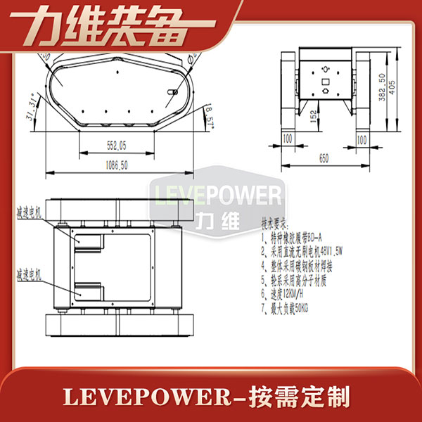 特種橡膠履帶底盤長1086mm,履帶底盤寬650mm,履帶底盤高382mm,無線遙履帶底盤搭載48V350W直流無刷永磁電機,RV50渦輪蝸桿減速機,動力更強。履帶底盤采用48V50AH鋰電池,續(xù)航時間更長。履帶底盤框架采用鋼板箱體焊接而成,底盤承載力大,是一款全地形履帶底盤。