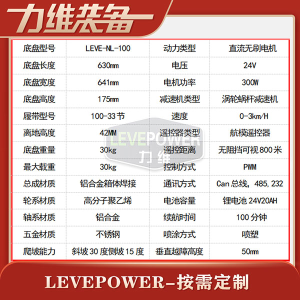 橡膠履帶底盤長630mm,橡膠履帶寬641mm,橡膠履帶高175mm,PWM航模遙控器控制,通信方式Can總線,232,485,橡膠履帶機器人功能強大,用途廣泛。特種履帶底盤動力采用箱體采用鋁合金材質(zhì)焊接而成,防腐性能好。越野履帶底盤動力采用24V300W直流無刷電機,渦輪蝸桿減速機動力更強,轉(zhuǎn)彎靈活。橡膠履帶底盤電池采用24V20AH鋰電池,續(xù)航時間更長,是一款不錯的機器人橡膠履帶。