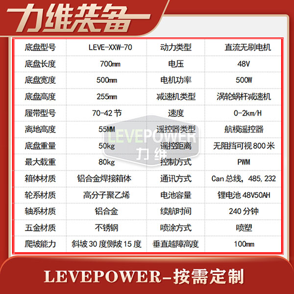 履帶底盤長(zhǎng)700mm,履帶底盤寬500mm,履帶底盤高255mm,無(wú)線遙控履帶底盤箱體采用鋁合金材質(zhì)焊接而成,防腐性能好。履帶底盤動(dòng)力采用48V500W直流無(wú)刷電機(jī),渦輪蝸桿減速機(jī)動(dòng)力更強(qiáng),轉(zhuǎn)彎靈活,爬坡性能穩(wěn)定。履帶底盤電池采用48V50AH鋰電池,續(xù)航時(shí)間更長(zhǎng),是一款不錯(cuò)的機(jī)器人橡膠履帶。