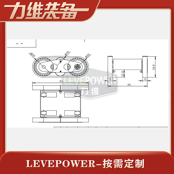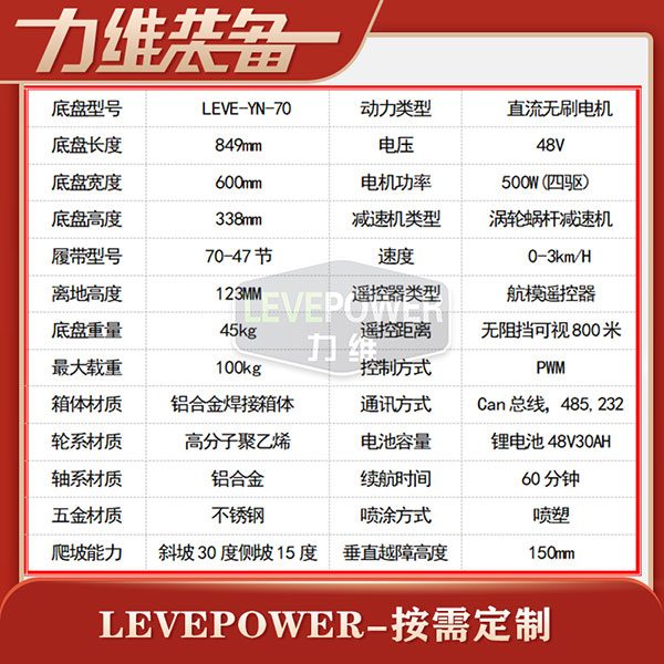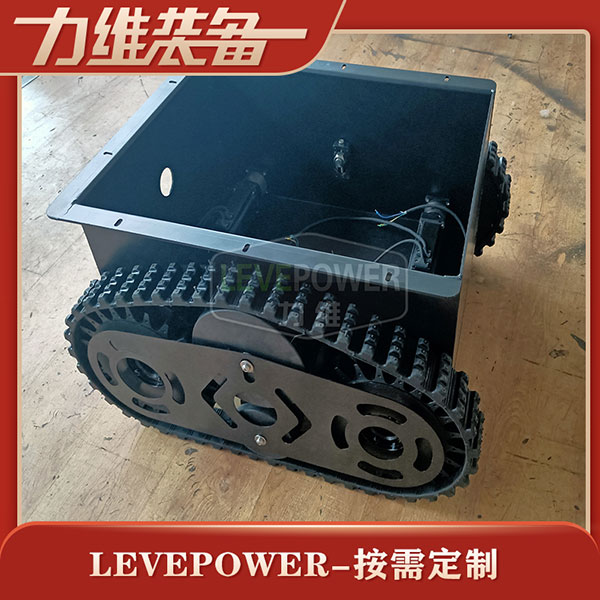 橡膠履帶底盤長849mm,履帶底盤寬600mm,履帶底盤高338mm,無線遙控履帶底盤搭載48V500W直流永磁無刷電機,RV渦輪蝸桿減速機動力更強,爬坡更有勁。